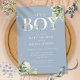 É um convite para chás de fraldas de menino que apresenta tipografia elegante e folhagem botânica bonito em um fundo azul empoeirado. Projetado por Thisnotme©