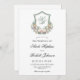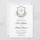 Este belo convite de casamento azul e empoeirado com a noiva e as iniciais do noivo cercadas por uma crista floral estonteante seria perfeito para o seu casamento. É tradicional, mas moderna, e as fontes são requintadas. As larkspur azuis, as rosas cor-de-rosa e branca, os lírios do vale e o verde-sabedoria são elegantes e românticos.