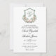 Este belo convite de casamento azul e empoeirado com a noiva e as iniciais do noivo dentro a crista floral seria perfeito para o seu casamento. É uma formulação tradicional, porém moderna, que inclui os nomes dos pais e as fontes são requintadas. As larkspur azuis, as rosas cor-de-rosa e branca, os lírios do vale e o verde sábia que rodeiam a crista verde são elegantes e românticos.