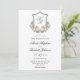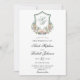 Este belo convite para o casamento azul-empoeirado com a noiva e as iniciais do noivo, dentro, uma bela crista verde rodeada de larkspur, rosas brancas e cor-de-rosa-pincelada, lírios do vale e verde-pavorosa, é único, fluido e romântico. É tradicional, mas moderna, e as fontes são requintadas. É perfeito para o seu casamento!