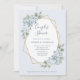 Este convite para chás de casamento simples e elegante apresenta as folhas românticas de cor aquática de eucalipto e rosas azuis empoeirados e flores de hydrangea em um falso quadro geométrico dourado e um fundo azul claro e empoeirado.