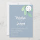 Celebre o seu amor com este elegante convite de casamento de monograma azul verde-verde elegante. Apresentando um fundo azul macio e poeirento com sotaque verde-aquarela e um monograma na moda, este convite é perfeito para casais que buscam um design de casamento moderno e inspirado na natureza. Personalize facilmente com seus detalhes.