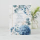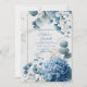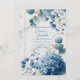 Invite your guests with breathtaking elegance using this sophisticated floral wedding invitation. The design showcases stunning, painterly watercolor arrangements in a romantic palette of dusty blues and soft whites. A lush dusty blue hydrangea cluster anchors the bottom corner, beautifully complemented by smaller delicate blue flowers, airy white baby's breath (gypsophila), and sprays of dusty blue-green eucalyptus leaves. This exquisite bouquet gracefully frames the central area in opposite corners, set against a chic, subtle white marble background. Delicate flecks of faux gold foil are scattered for a touch of magical shimmer, while a minimalist, thin gold rectangular frame provides a clean, elegant border for your event details. Perfect for sophisticated weddings (especially with a 'something blue' theme), this design is also ideal for elegant bridal showers, milestone birthday celebrations, anniversary parties, baby showers, or upscale garden events. This versatile design can also be adapted for sophisticated corporate galas, charity fundraisers, or elegant announcements requiring a touch of refined floral beauty.