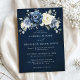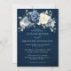 Convite para o casamento floral azul empoeirado, com buquê elegante de azul marinho, azul real, branco, ouro, marfim de champanhe, rosa de cor esbranquiçada, botões de flor ranunculus e folhas de eucalipto verde-sábio e buquê de cor d'água elegante. Entre em contato comigo para obter ajuda sobre a personalização ou se você precisar de outro produto com este design.