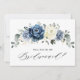 O floral azul Dusty será minha dama de honra? Convite com um buquê elegante de azul marinho, azul real, branco, ouro, marfim de champanhe, rosa de cor esbranquiçada, botões de flor ranunculus e folhas verdes de eucalipto sábio e buquê elegante de aquarela. Entre em contato comigo para obter ajuda sobre a personalização ou se você precisar de outro produto com este design.