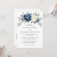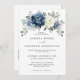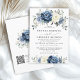 Convite para o casamento floral azul empoeirado, com buquê elegante de azul marinho, azul real, branco, ouro, marfim de champanhe, rosa de cor esbranquiçada, botões de flor ranunculus e folhas de eucalipto verde-sábio e buquê de cor d'água elegante. Entre em contato comigo para obter ajuda sobre a personalização ou se você precisar de outro produto com este design.