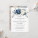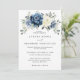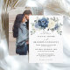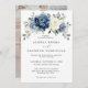 Convite para o casamento floral azul empoeirado, com buquê elegante de azul marinho, azul real, branco, ouro, marfim de champanhe, rosa de cor esbranquiçada, botões de flor ranunculus e folhas de eucalipto verde-sábio e buquê de cor d'água elegante. Entre em contato comigo para obter ajuda sobre a personalização ou se você precisar de outro produto com este design.