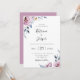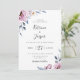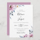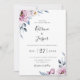 Elegante azul empoeirado, maduro e aquarela branca arranjos florais com ramos botânicos suaves, convite para casamento. Modelo do estilo design de tipografia romântica. A parte traseira da placa apresenta uma cor mauve de coordenação sólida.
