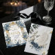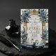 Invite your guests to a storybook romance with this majestic design that captures the essence of a royal garden. Featuring graceful swans and lush blooms, this suite sets the perfect tone for a happily ever after celebration. The blend of antique architecture and soft waters creates a sophisticated, dreamlike atmosphere for your special day.A symmetrical composition featuring two white swans facing inward on a deep blue rippled water base. They are framed by two tall, golden Corinthian columns supporting an ornate, filigree gold archway. Color Palette: Dusty blue and navy roses with sage green foliage cascade down the columns. The background simulates a clean white marble texture. Typography: "Wedding" is written in a large, whimsical gold calligraphy script, while names and details utilize a traditional serif font in navy ink. Material Note: Please note that the gold foil, marble stone, and water textures are digital high-resolution prints (flat ink) and do not contain real metal foil or raised textures.