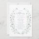 Uma delicada e elegante cor d'água, moldura de flor silvestre, enrola seus detalhes de evento em azul empoeirado. Paletas de pastel de amarelo macio, branco esbranquiçado, verde-sábio, azul empoeirado e verde botânico, verde-botânico, floral de Excelente de uma flor-de-galinha convites para festa rústica moderna, festa de jardim de boho na primavera e no verão.