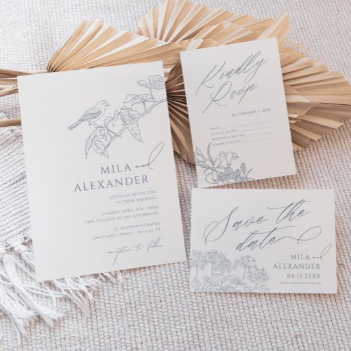 Convites Dusty Blue Vintage Floral Songbird Wedding