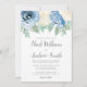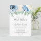 Lindas flores azuis empoeiradas são combinadas com rosas de marfim e verde macio. Este elegante convite para casamento de aquarelas é uma escolha na moda para noivas modernas.
