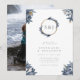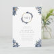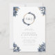 Este convite é uma escolha perfeita para qualquer casal que procura um convite elegante para o seu dia especial. Este design apresenta buquês lindíssimos, azuis e poeirentos, de folhas delicadas e flores nos cantos do design, com um monograma das suas iniciais no topo, enquadrados numa coroa dourada e coroa floral. Sob seu monograma está sua tipografia de convite em uma mistura clássica, mas moderna de fontes.