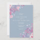 Um convite bonito para casamento de flores silvestres com uma mistura de buquês de flores silvestres roxas, lilás e cor-de-água rosa. Este elegante convite de casamento pode ser personalizado com a sua informação especial do dia do casamento em tipografia branca-chique num fundo azul empoeirado. Projetado por Thisnotme©