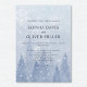 Um convite de casamento na moda com uma cena sonhadora e romântica de pinheiros desbotados e flocos de neve em tons luxuosos de azul empoeirado. Esta cena serena e contemplativa do país vai mesmerizar os seus convidados. Você pode alterar os nomes e a data clicando no botão personalizar. Este convite glorioso faz parte de uma suíte de casamento correspondente.
