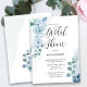 Chá de panela elegante com folhas de eucalipto e bela caligrafia. Este delicado design tem uma lavagem aquosa com cor de água verde e folhagem em tons de cinza azul empoeirado e verde. Um design natural, rústico e não-floral, que se adapta a uma variedade de temas, desde jardim clássico até boho orgânico e mínimo moderno. Por favor, navegue na minha loja, na empoeirada coleção de eucaliptos, para coordenar convites de casamento, cartões de cerimônia e acessórios de correio.