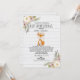 Um convite de chá de fraldas com ilustração de uma raposa bebê vestindo uma coroa de flores. Poema personalizado. Personalize o texto. O fundo é a cinza de madeira de design leve inspirada.