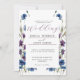 O convite para o casamento floral elegante e moderno contém flores azuis e roxas, folhas botânicas verdes de sábado e eucalipto. por favor, encontre mais designs correspondentes na minha loja de "ouros".