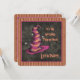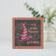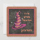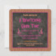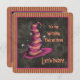 Um convite de festas quadrado divertido com uma bruxa rosa flutuante e laranja encantada que diz "É a Hora de Testemunhar do Ano, Festa de Vamos" sobre um fundo negro de carvão negro com uma borda rosa. Todos os detalhes do partido editável estão no verso.