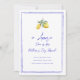 Apresentamos o nosso incrível convite para o Dia de as mães para a última celebração inspirada pela Itália! Este convite apresenta uma caligrafia azul elegante, perfeitamente aliada a uma pequena ilustração do ramo de limão, criando um design chic sofisticado. O verso do convite inspira-se nos clássicos azulejos azuis italianos, acrescentando um toque extra de elegância e transportando-os para as ruas pitorescas da Itália.