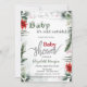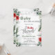 Ramais de pinheiros aquíferos, poinsettia e luzes de triagem sobre fundo branco. Esses convites para chuveiros de bebês são facilmente personalizados para seu evento simplesmente adicionando seus detalhes.