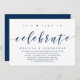 Tema azul marinho elegante em Script moderno, cartão de convite de casamento íntimo (É Hora de Celebrar). É perfeito para a sua celebração casual de casamento às margens de um lago.