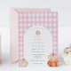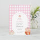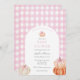 Convite para chá de fraldas com uma estrutura arquivada com abóboras e arco cor-de-rosa com um fundo de padrão de gingham rosa. Personalize com suas informações para que a mãe esteja. Clique em "clicar para personalizar mais" para alterar o estilo, o tamanho ou a cor da fonte.