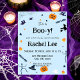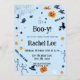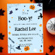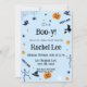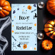 Um simples e sofisticado convite para chás de fraldas de Halloween para bebês. Fantasmas bonitos, abóboras, morcegos, doces, chapéus de bruxas, esqueletos, e espiar uma tipografia surround spooky sobre um fundo azul claro. Perfeito para o outono e chás de fraldas de Halloween com esquema de cor laranja, roxo, preto e branco.