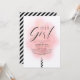 Este convite de chá de fraldas "é uma menina", chique e moderno, apresenta um fundo branco com um doce de algodão rosa. O verso apresenta um fundo branco com faixas diagonais pretas. Personalize-o para as suas necessidades. Você pode encontrar produtos correspondentes na minha loja.