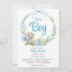 É um modelo de convite para chás de fraldas de arco floral de ursinho. Urso de pelúcia bonito com fita azul e balões azuis para chá de fraldas de meninos.