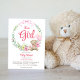 É um modelo de convite para chás de fraldas de arco floral para ursos de peluche. Urso de pelúcia bonito com fita cor-de-rosa e balões cor-de-rosa para chá de fraldas feminino.