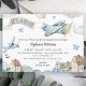 Celebre a chegada de um bebê com este belo convite de chá de fraldas com um avião azul voando sobre a cidade com um cartaz anunciando "É um menino!". Nuvens, pássaros e estrelas enche o céu nesta cena do livro de aquarelas para celebrar a feliz ocasião. Personalize o texto do exemplo com os detalhes do seu chá de fraldas.