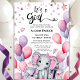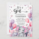É uma garota! Bebê Elefante Rosa Balões Rosa, Um Cartão De Convite Para Chás de fraldas Bonito. Celebre a chegada do seu bebê precioso com este cartão de convite festivo, chico e bonito com balões de aquarela coloridos, estrelas e corações festivos que brilham ouro, conjuntos de presentes bonito embrulhados com fitas e e-mails decorados florais. Todos os textos estão pré-organizados para que você personalize fácil e rapidamente com os detalhes do seu chá de fraldas.