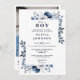 Este elegante convite para chás de fraldas florais azuis de 'é um menino' pode ser personalizado com suas informações na tipografia moderna, uma foto especial no verso, e seu código QR de registro. Projetado por Thisnotme©