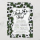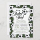 Um convite moderno ao chá de fraldas desportivo ousado e brilhante, com uma bola de futebol fofa. Nossa, é um convite para o futebol de um bebê garoto.. é colocado em um plano de fundo de grama fofo e tem um retorno para um toque especial extra. Perfeito para um chá de fraldas de garotos estrelas