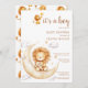É um menino, leão bebê sentado sobre a lua, convite para chás de fraldas de aquarela. Encantador e caprichoso. Estrelas e nuvens. Vibrante