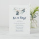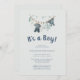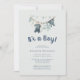 É um convite para Chás de fraldas de roupas masculinas Este doce convite apresenta uma linha de roupas com roupas de bebês penduradas na linha.