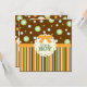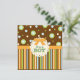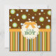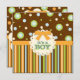 Listras divertidas e círculos de cor laranja, verde e azul num fundo de chocolate marrom têm um efeito de costura falsa que é simplesmente adorável neste convite de chá de fraldas para um rapaz. Sombreado sutil dá-lhe uma aparência dimensional que certamente agradará. E não se esqueça de combinar adesivos para decorar favores, cupcakes ou selar os envelopes do convite!