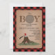 Convite para chá de fraldas Woodland lumberjack apresentando uma ilustração de um disco de madeira incorporado no texto "BOY" com uma ilustração de um toco de árvore com machado no fundo. O estoque de papelão é inspirado na borda de xadrez de búfalos vermelho e preto.