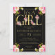 Flores cor-de-rosa dramáticas em cada canto junto com bordas de aquarela sobrepostas ao texto dourado, a arte "Girl" faz uma declaração dramática sobre o fundo preto com todo o texto dourado na frente deste design Chá de fraldas. O design traseiro apresenta um padrão bolinhas dourado com um buquê floral de cor d'água central. Design composto por Holiday Hearts Design (direitos reservados).