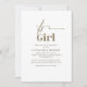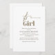 Suave, na moda, e absolutamente charmoso! Este convite de chá de fraldas "É uma Menina", acentuado em ouro, é a forma perfeita de celebrar a sua pequena princesa. Com um toque minimalista e uma tipografia elegante, traz uma sensação moderna, mas eterno, ao seu evento especial. Um chá de fraldas de classe!