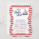 Um convite para chá de fraldas de veleiro moderno e brilhante com um veleiro vermelho e azul. Nossa, é um convite náutico para bebês é colocado em um fundo zigue-zague vermelho e tem um retorno para um toque especial extra. Perfeito para um pequeno chá de fraldas marinheiro