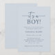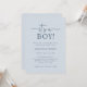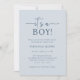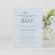 Prepare-se para dar as boas-vindas ao seu pequeno ao mundo com este convite de Chá de Bebê 'É um Menino' que apresenta texto azul-marinho em um fundo azul claro empoeirado com uma elegante fonte de caligrafia, perfeito para definir o tom para uma celebração sofisticada!