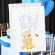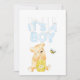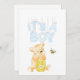 Uma chá de fraldas de design "É um Rapaz" com um ursinho de pelúcia bonito com um barril de mel assistindo uma abelha de mel fofinha. A divertida timento tipografia azul-escarlate está pendurada em cima com cordas bonitinhas e pendurada para baixo. Flores azuis e modelos para criar seu próprio convite de volta.