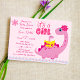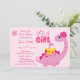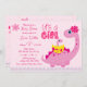 É uma garota eclodindo logo uma mãe rosa de dinossauro com convite para chá de fraldas de ovo dino.