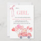 Este encantador convite para o chá de fraldas celebra a chegada de uma menina com um design quente e caprichoso. A frase "IT S A GIRL" ganha palco central em uma fonte elegante, de coral macio, combinada com uma ilustração decorativa de fita para um toque de sofisticação. Abaixo, os detalhes personalizados do evento são bem organizados em uma fonte graciosa para facilitar a leitura. O fundo mostra uma ilustração adorável de um carregando vermelho vintage de um pacote de balões cor-de-rosa em forma de coração, evocando alegria e festividade. O design geral combina calor, elegância e brincadeira, fazer perfeito para uma celebração especial.