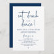 Announce your happily ever after in style with our modern minimalist casual script design wedding reception elopement dinner celebration invitation card in navy blue theme. Our Happily Ever After "eat, drink and dance!" Invitation card is ideal for couples who have decided to elope and want to host a party to celebrate their union. With its sophisticated yet playful design, this invitation is sure to set the tone for an unforgettable event. The invitation card features a minimalist design with a black and white scheme, adding a touch of timeless elegance to your celebration.