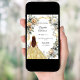 Um fundo com aspecto de ouro. Decorados com os florais brancos e amarelos e uma fita de ouro. Uma garota vestindo uma tiara e um vestido. Personalize e adicione um nome e detalhes. Fundo: um fundo de ouro falso.