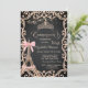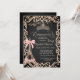 A modern, chic and glamorous invitation with an elegant gold tiara, dress, Eiffel Tower with pink bow, and glitter butterflies on a gray background.