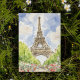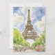 Este postal apresenta uma pintura aquosa da Torre Eiffel em Paris, França.